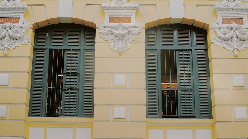 Mặt tiền của tòa nhà có các ô cửa hình chữ nhật với phần vòm ở phía trên, họa tiết trang trí mang phong cách châu Âu. Trên đó còn ghi danh những nhà phát minh ra ngành điện tín và ngành điện.