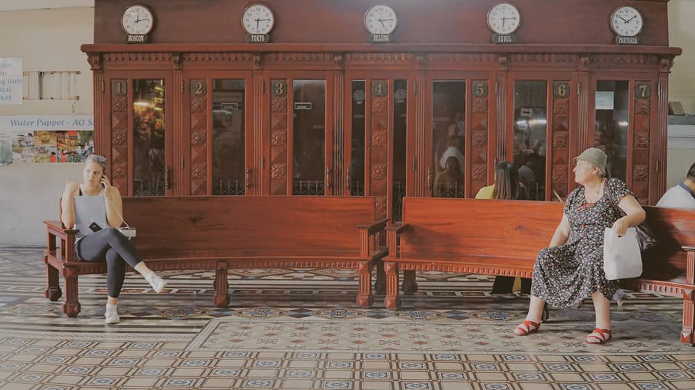 Nằm ở trong cùng là bốn dãy bàn ghế gỗ được xếp dọc để phục vụ người có nhu cầu khai báo, ghi chép để gửi bưu phẩm, thư từ.