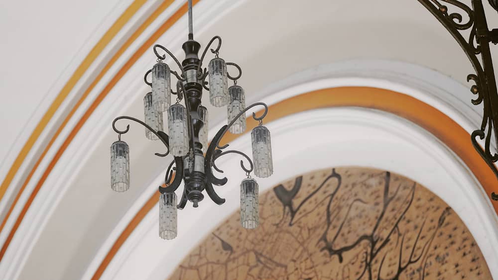 Chiếc đèn treo trong bưu điện có kiểu dáng xưa cũ.