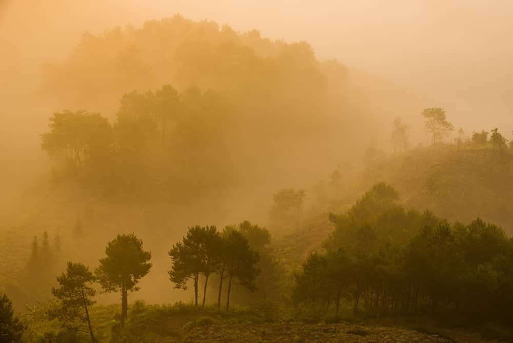 Sáng sớm, nơi đây thức giấc giữa ánh sáng chan hòa lẫn trong sương sớm. Lúc này, sương mù xuất hiện bao phủ khắp đồi núi hòa cùng ánh nắng ban mai, len lỏi qua những tán cây, ngọn cỏ, tạo nên bức tranh thiên nhiên dịu mát và yên bình.
